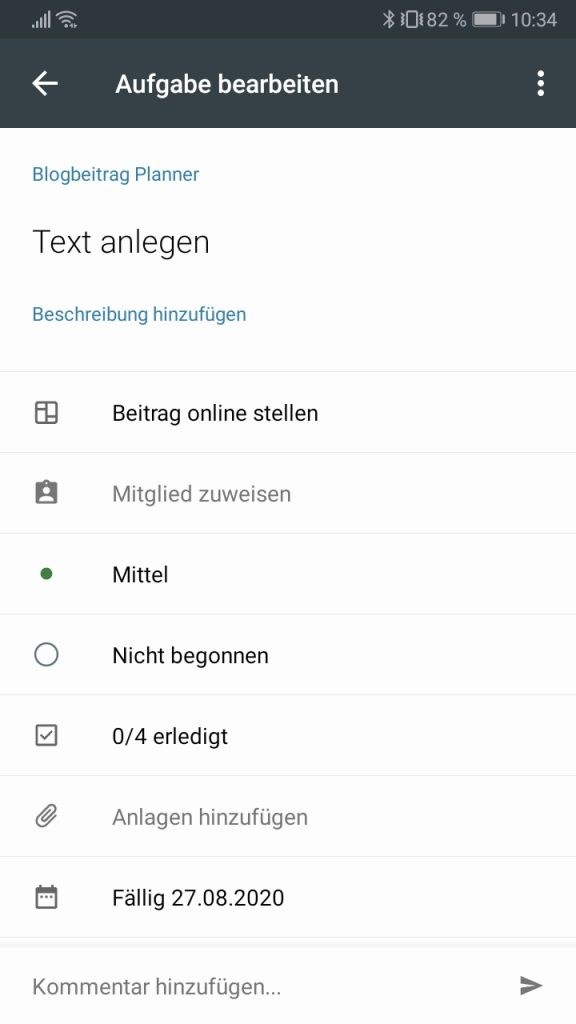 Die integrierten Status von Planner unterscheiden nur zwischen „nicht begonnen“ „in Arbeit“ und „abgeschlossen“. Dies ist natürlich nicht sehr präzise, wenn andere sehen sollen, wie weit Sie bereits gekommen sind. Daher kann die Kommentarfunktion hier eine sinnvolle Alternative für ergänzende Angaben sein.